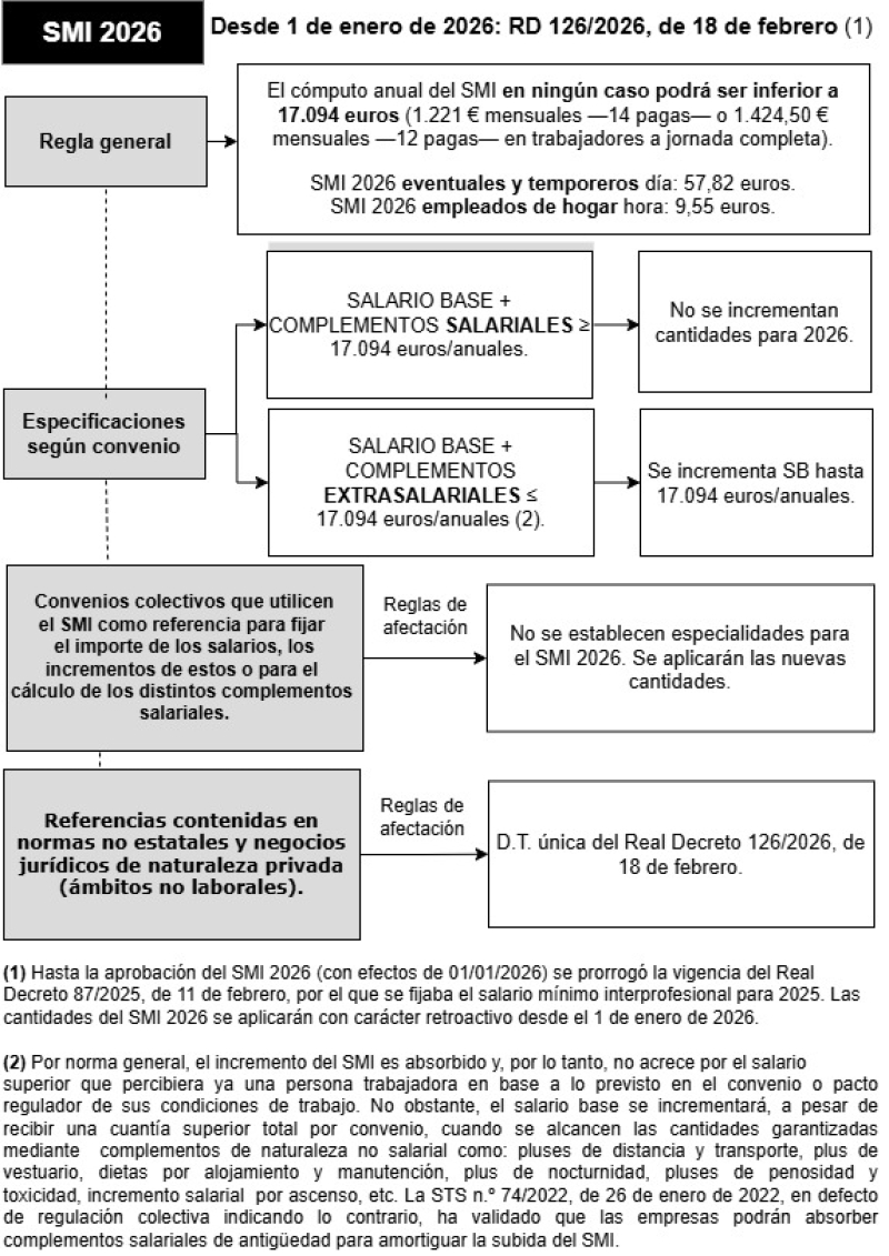 Para saber si un convenio alcanza las cantidades obligadas por el salario mínimo citado se le sumará al salario base, en su caso, según indique el convenio o contrato de trabajo, los complementos salariales (art. 26.3 del Estatuto de los Trabajadores). La revisión del SMI no afectará a la estructura o cuantía de los salarios que superen 17.094 euros anuales (art. 3 del Real Decreto 126/2026, de 18 de febrero).